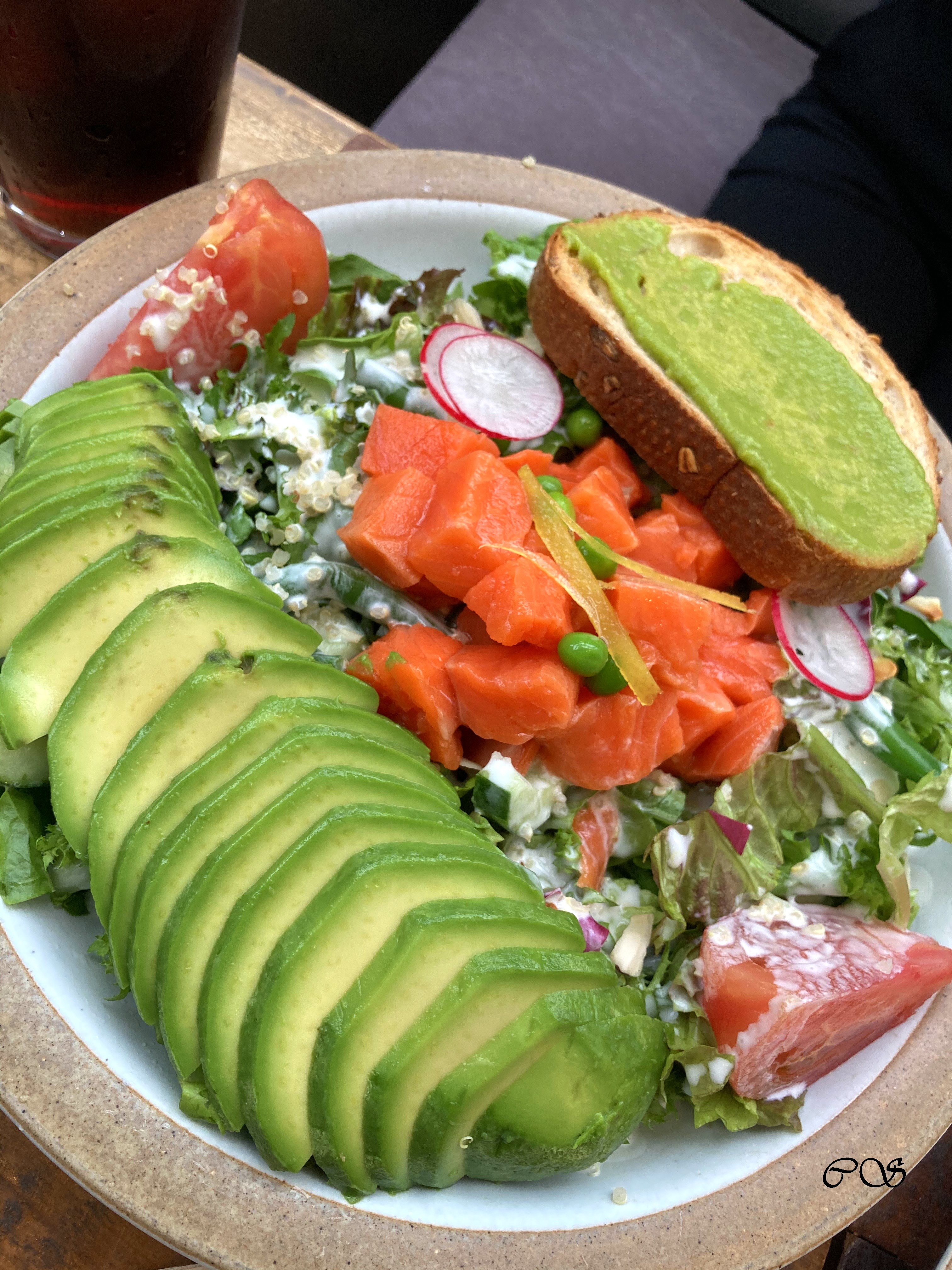 아보카도 샐러드에는 훈제 연어, 아보카도, 토마토, 야채 등이 많이 들어가 있습니다. 함께 나온 빵에 샐러드 올려서 먹으니 맛있었습니다. 드레싱도 괜찮고 해서 야채 싫어하는 사람도 잘 먹을 듯합니다.