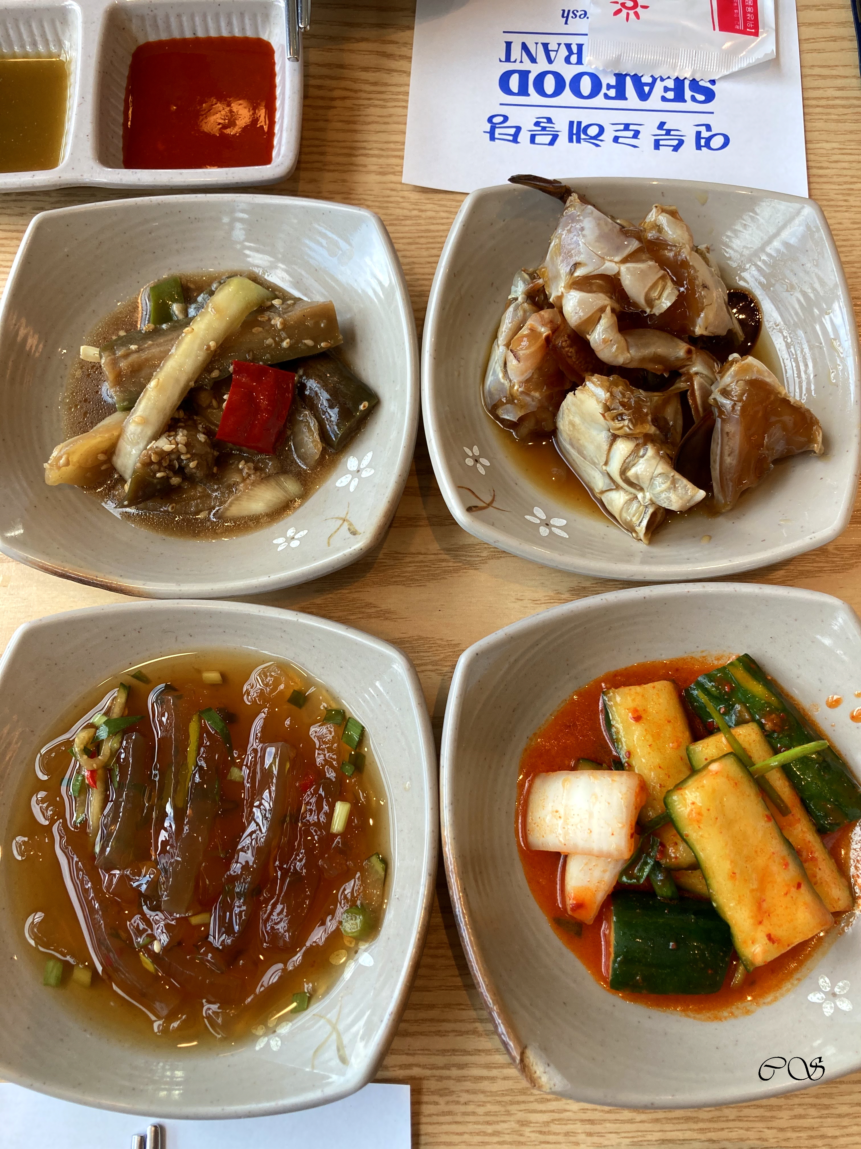 밑반찬입니다. 밑반찬 중에서 기억 남는 거는 보리 김치랑 게장이 기억납니다.
