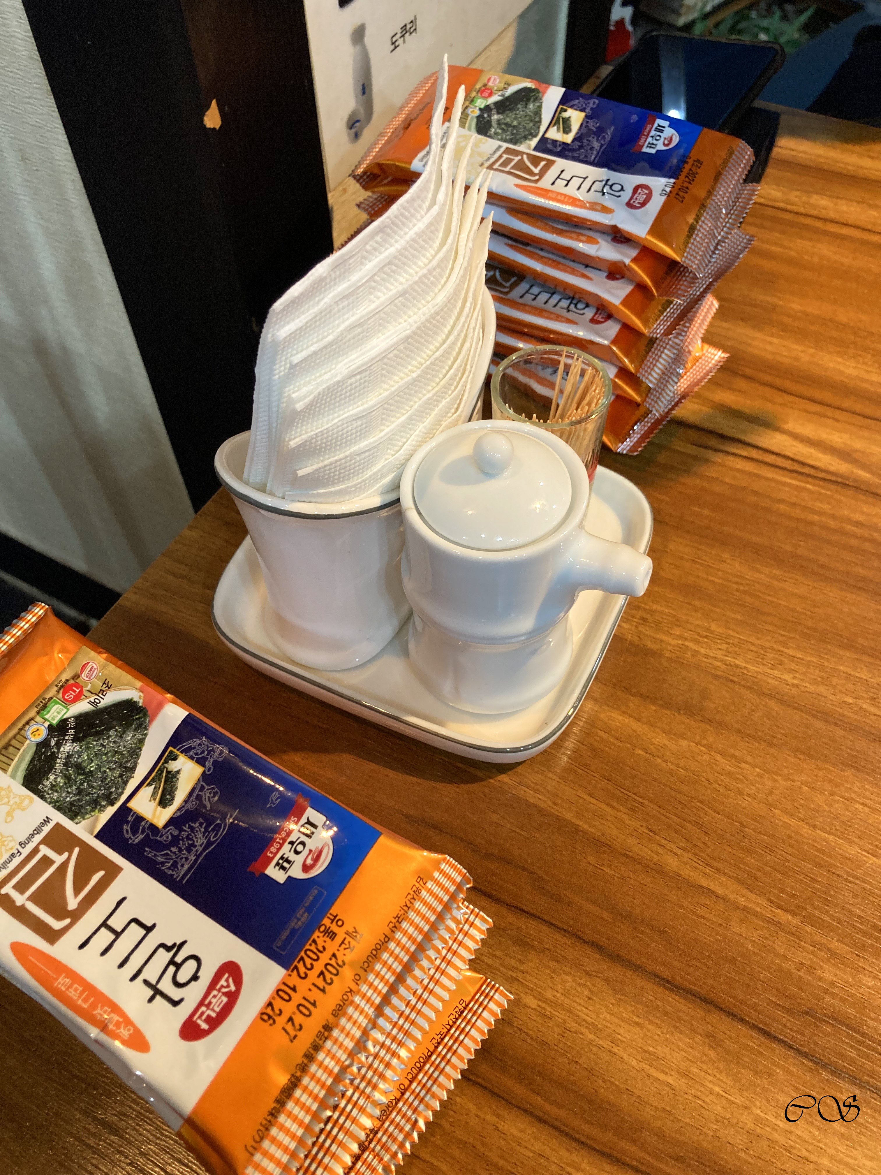 테이블 위에 완도 김과 참기름이 올려져 있습니다. 김은 완도죠.
