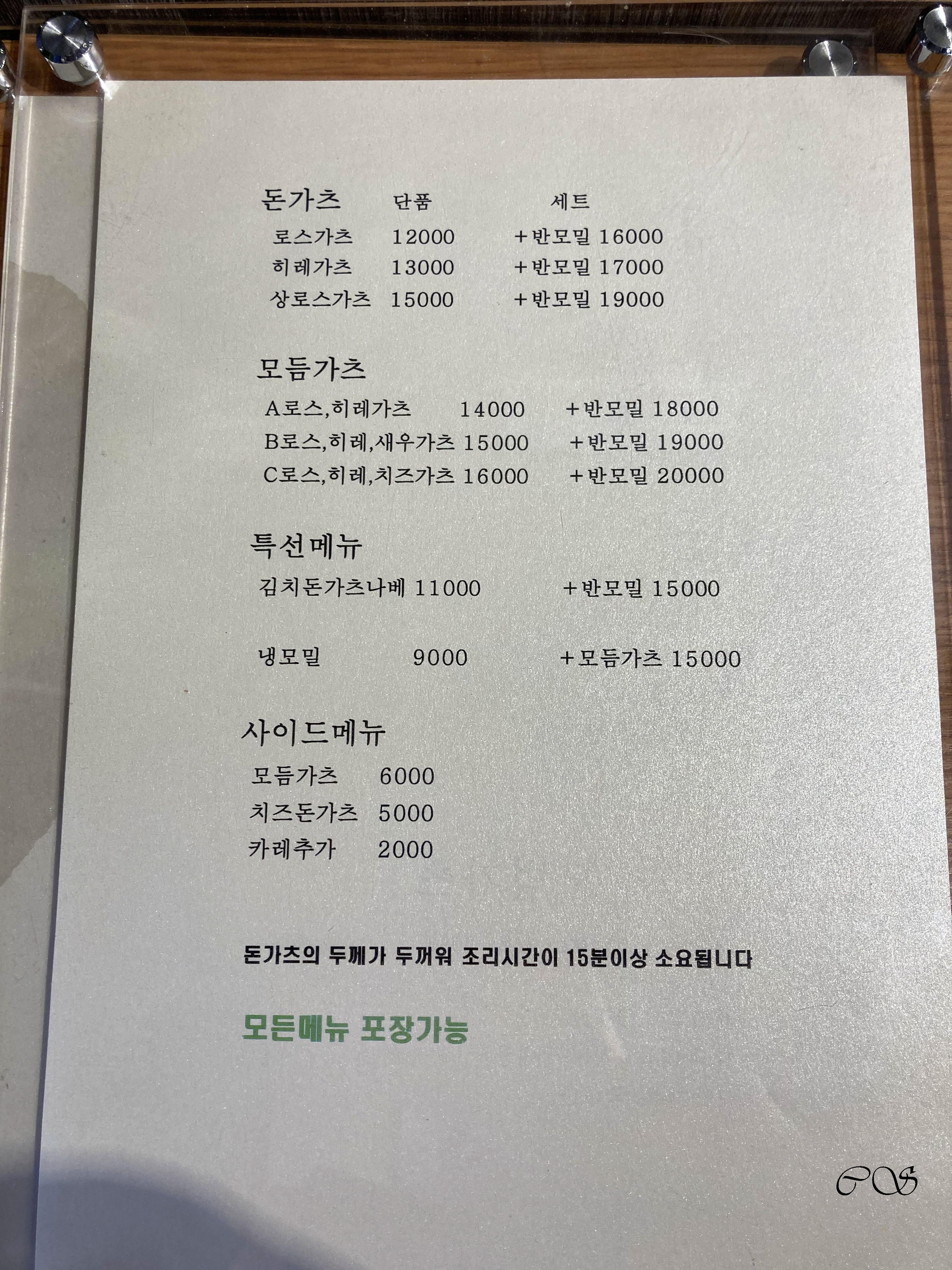 문정으로 이사 오고 괜찮은 식당을 못 찾았는데 모범가츠는 괜찮은 식당이라 생각합니다. 토요일 오후에 갔는데 웨이팅은 5분 정도 있었지만 바로 들어갔습니다. 우리는 히레가츠+반모밀(17,000원)과 상로스가츠+반모밀(19,000원) 세트로 주문했습니다. 세트로 주문을 하면 반모밀이 함께 나옵니다.