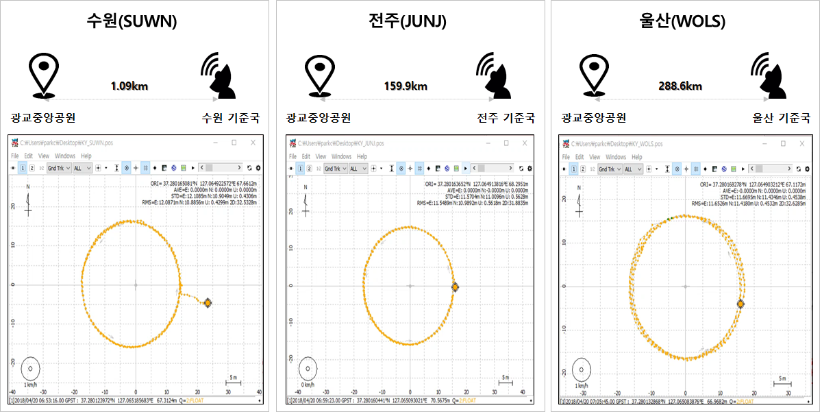 단일 RTK 기법을 이용한 측위 시험을 하기 위해서는 기준국과 사용자 수신기와의 최대 거리는 10~20km를 초과해서는 안되기 때문에 이번 실험에서는 기준국과 사용자 수신기 거리에 따른 측위 성능 비교 실험을 진행해봤습니다.