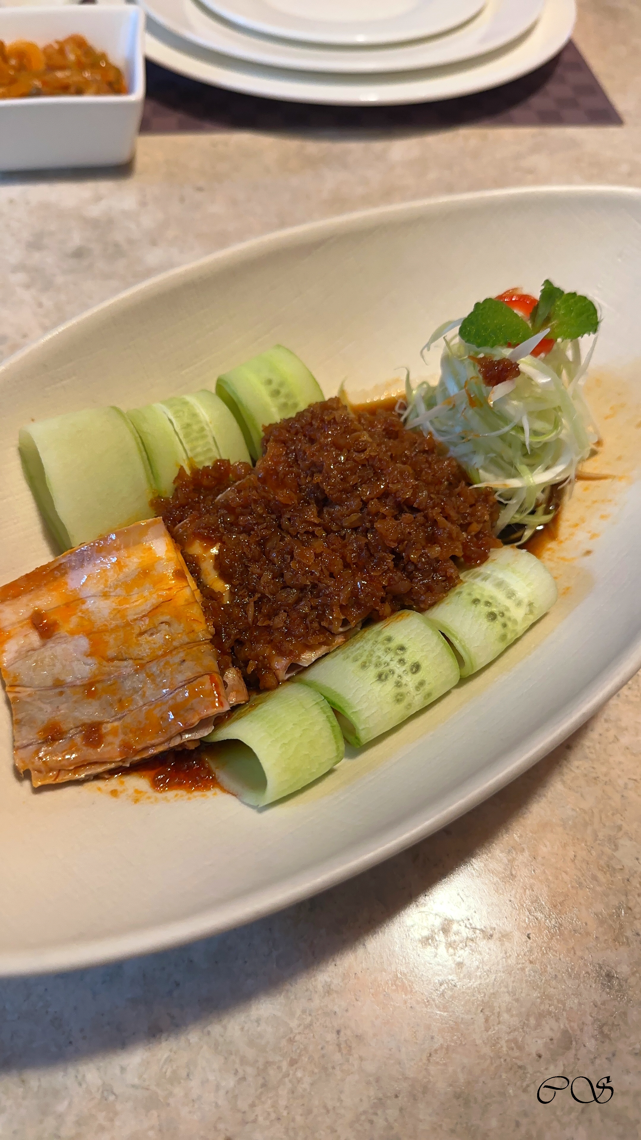 마늘 소스 맛있고, 오이랑 담백한 돼지고기랑 같이 먹으니 상당히 괜찮았습니다.