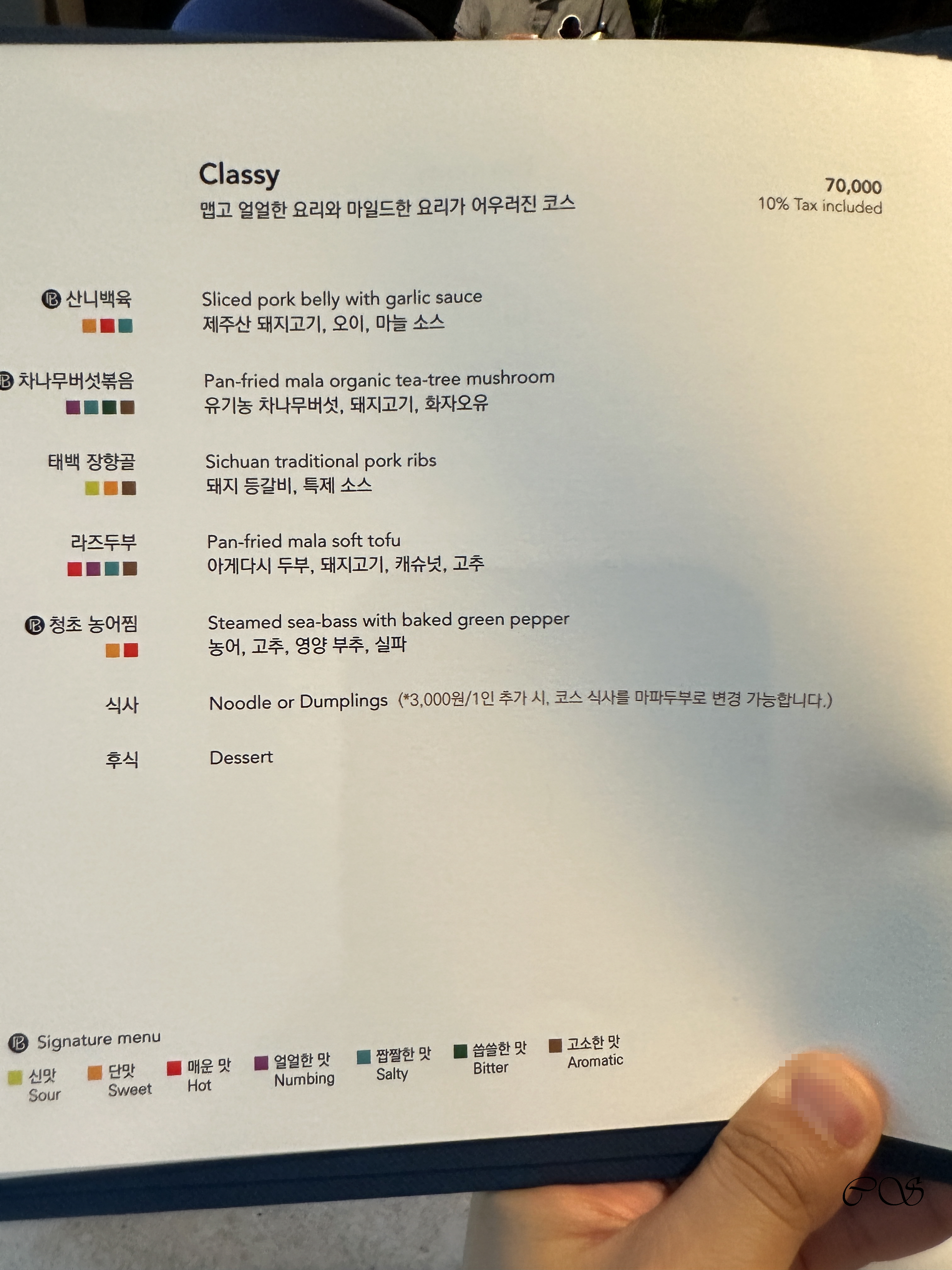기념일이라 평소에 먹어보지 않았던 식당을 찾다가 청담(압구정로데오역)에 있는 사천요리 전문 중식당 파불라를 찾았습니다. 저희는 런치에 방문해 클래시(Classy) 코스를 주문했습니다. 클래시는 맵고 얼얼한 요리와 마일드한 요리가 아우러진 코스입니다. 맵고 얼얼한 요리가 싫으시다면 마일드를 주문하셔도 됩니다. 클래시 런치 1인 가격은 70,000원입니다. 파불라에서 차나무버섯볶음이 유명하다고 하여 기대했습니다. 암튼 기념일에 나름 괜찮게 식사를 할 수 있었습니다.