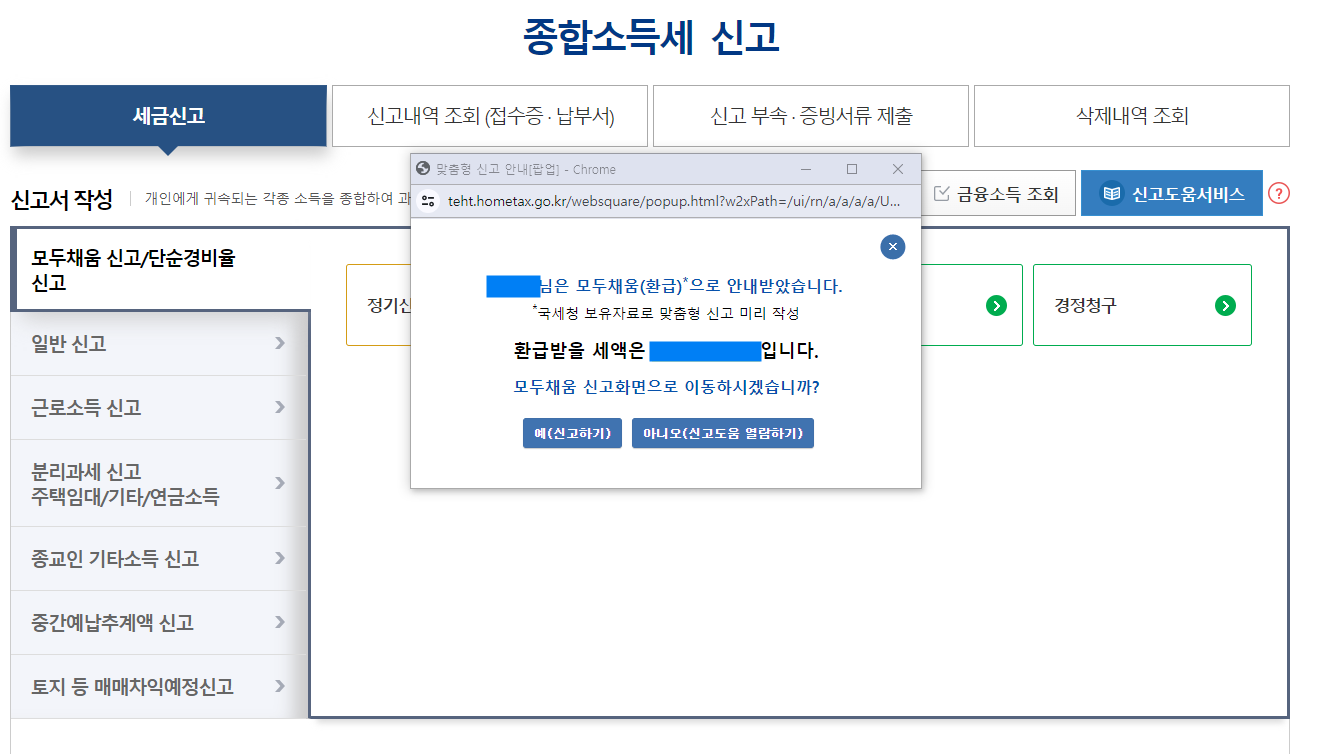 올해 역시도 작년과 동일하게 종합소득세 신고를 클릭하면 환급받을 세액이 얼마인지 알려준다.