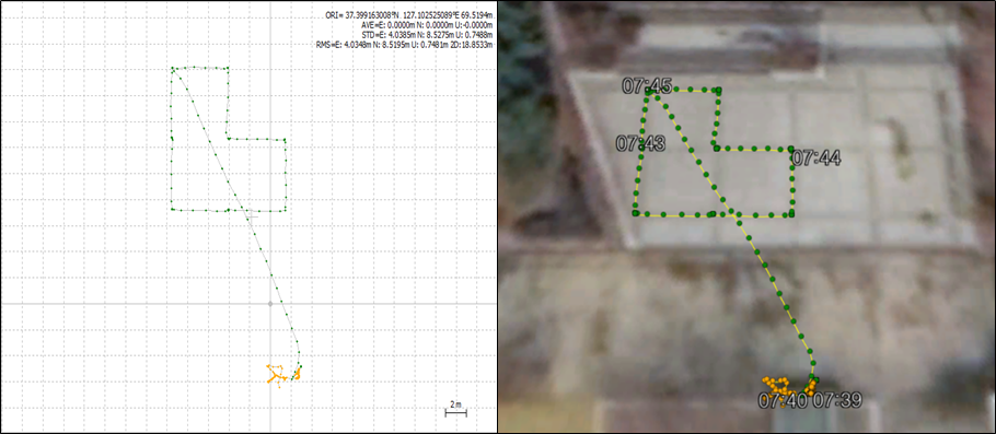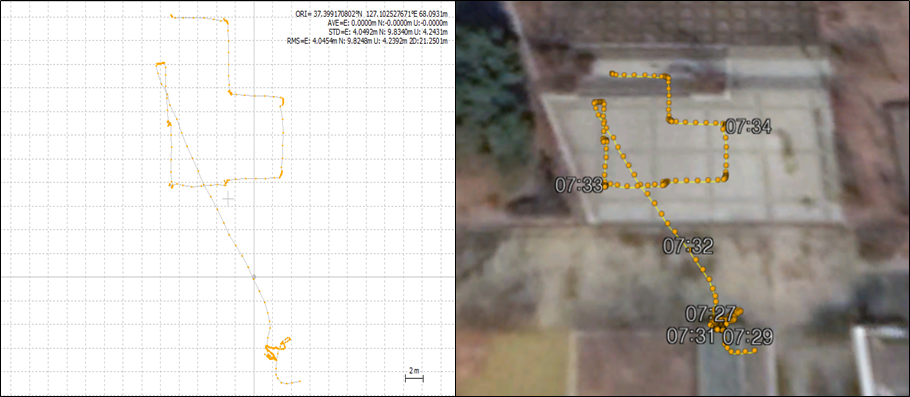 총 3회 측위 실험 중에서 1차 실험에서는 부정확한 모습이 보였습니다. 측위 동안 계속 Float 였습니다. 2차 실험에서는 대부분이 Fix가 나온다는 것을 알 수 있었고, 3차 실험에서는 중간 이후부터 Fix가 되었습니다. 정확도 성능은 확인을 위해서 Trimble R2로 이미 몇 개의 위치를 찍어서 정확도 결과를 비교하였지만, 여기에는 명시하지 않겠습니다.