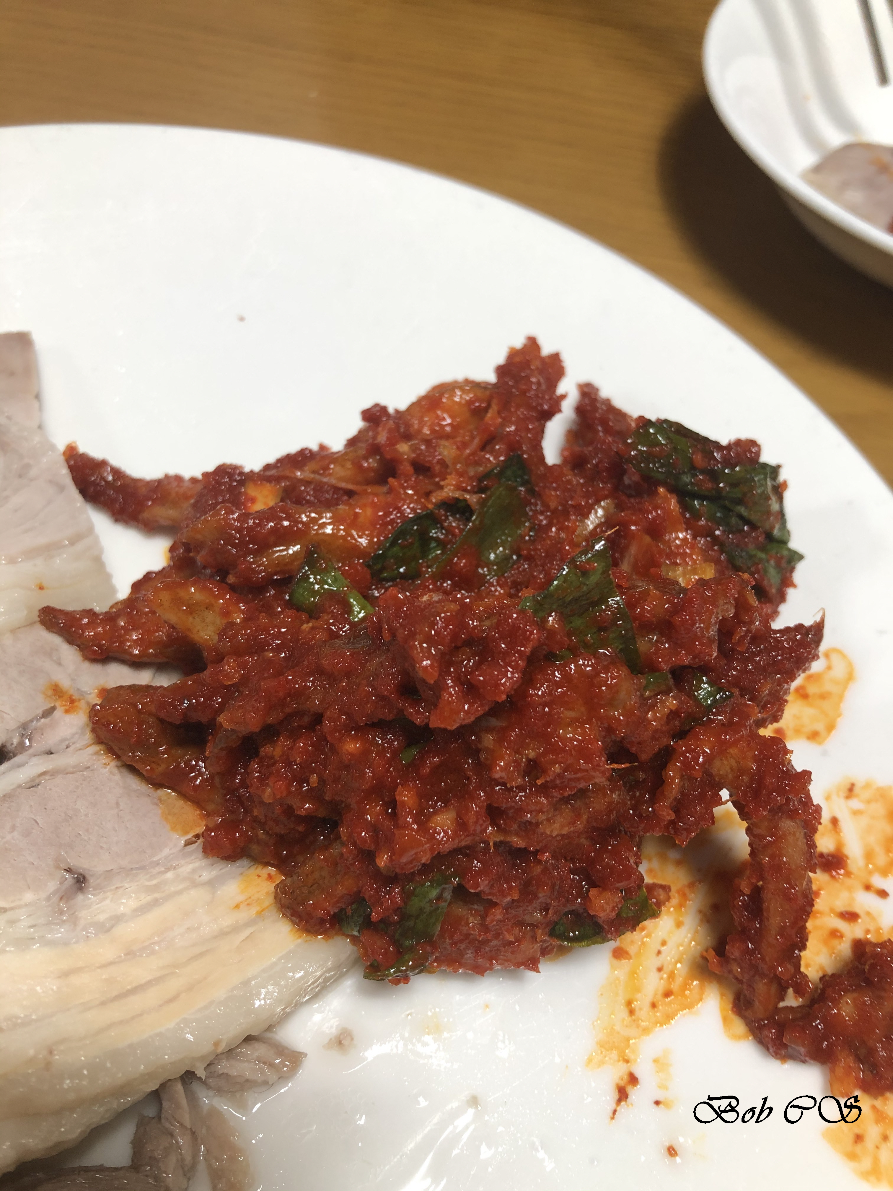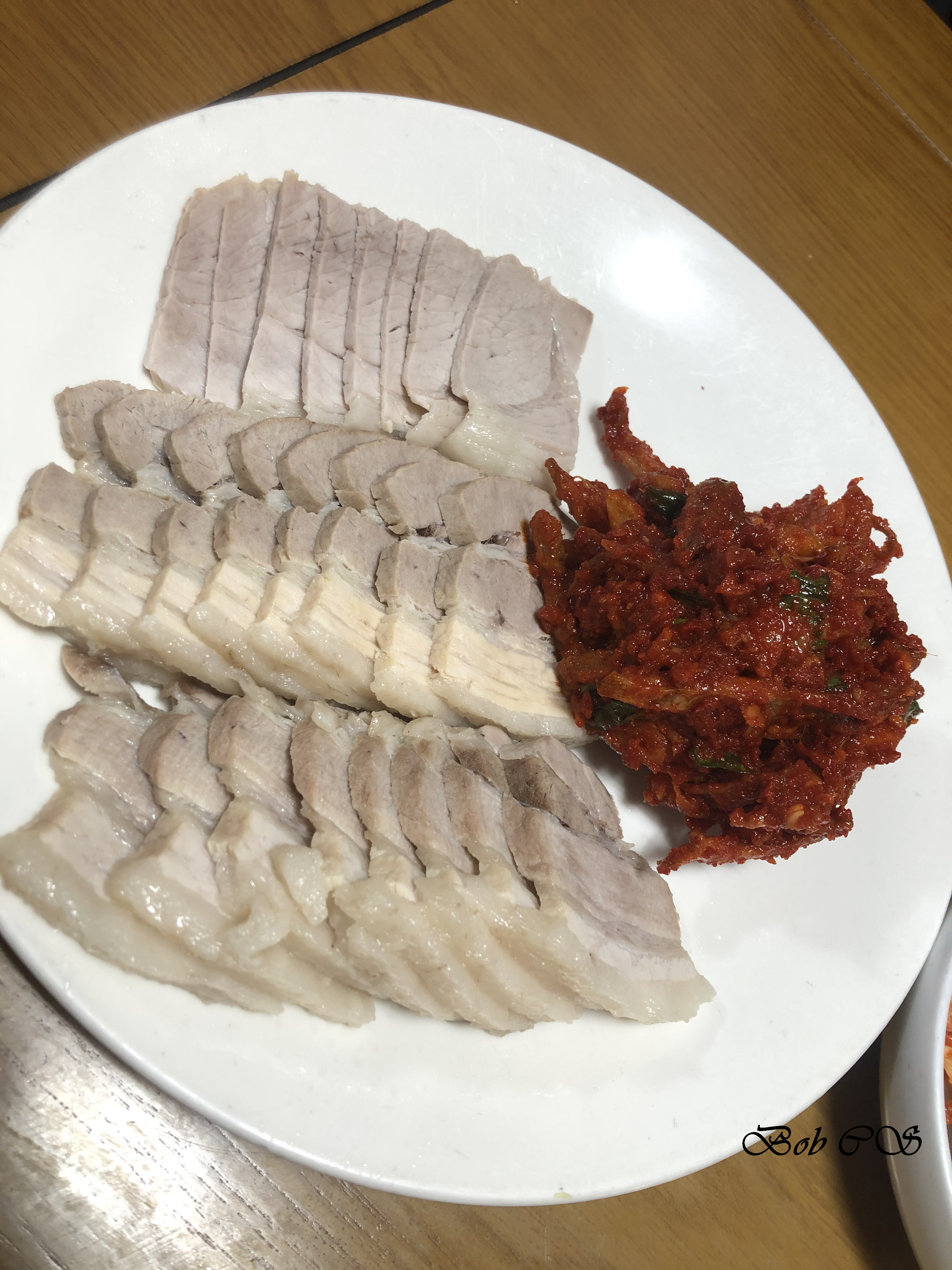 따끈따끈한 돼지고기 수육이 나왔습니다. 생각했던 것보다 수육과 가자미회무침 양이 많았습니다. 수육은 부드러워서 먹기 좋았고 돼지 잡내는 전혀 나지 않았습니다. 그리고 가자미 회무침은 오래 숙성이 되어서 탱탱하지 않고 흐물흐물한 회무침 맛이 좋았습니다.