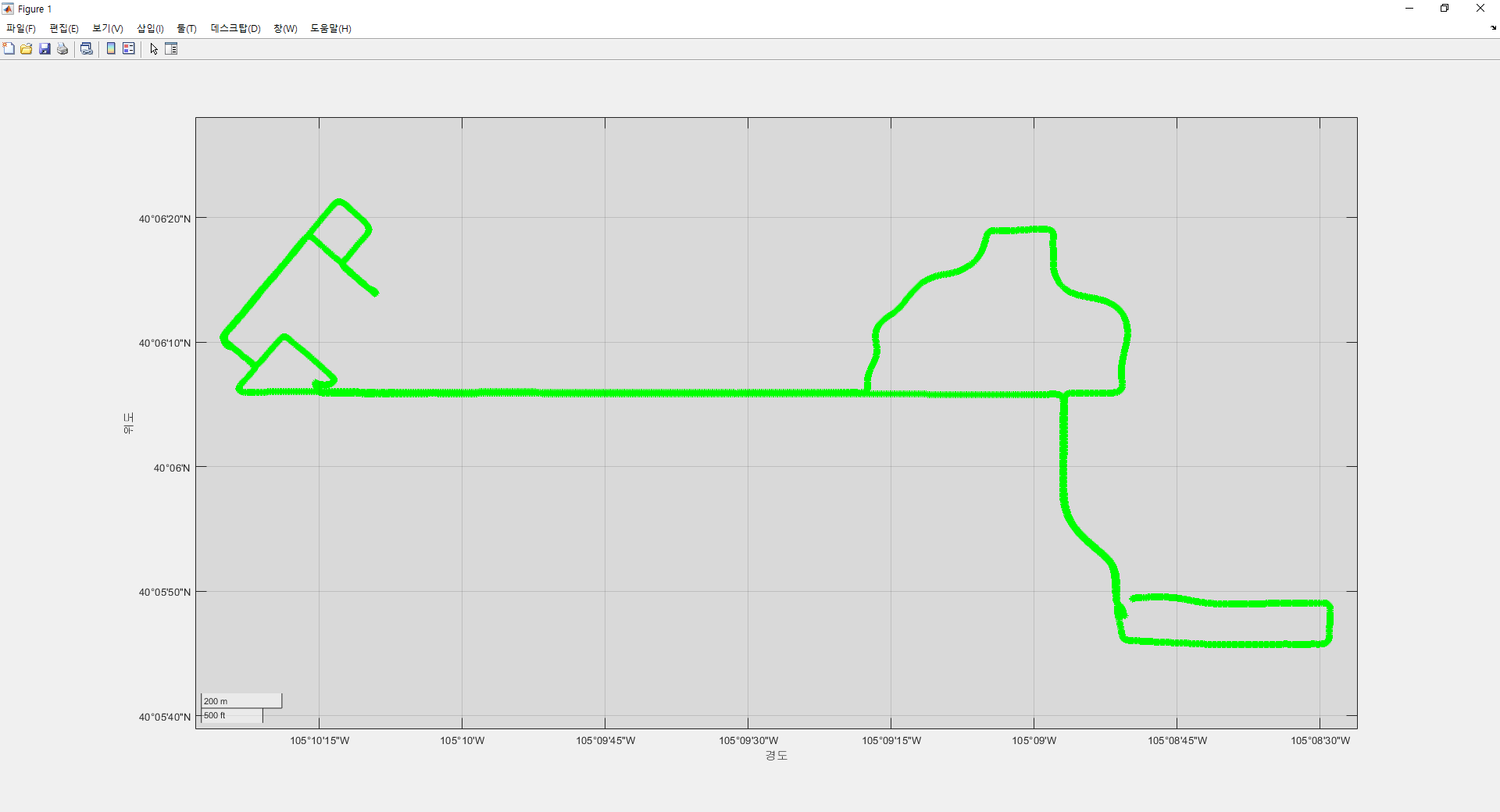 아래 그림은 MATLAB을 이용하여 위치 값(위도, 경도)을 표신한 그림입니다. RTKPLOT에서 표시된 위치 결과와 동일하다는 것을 알 수 있습니다.