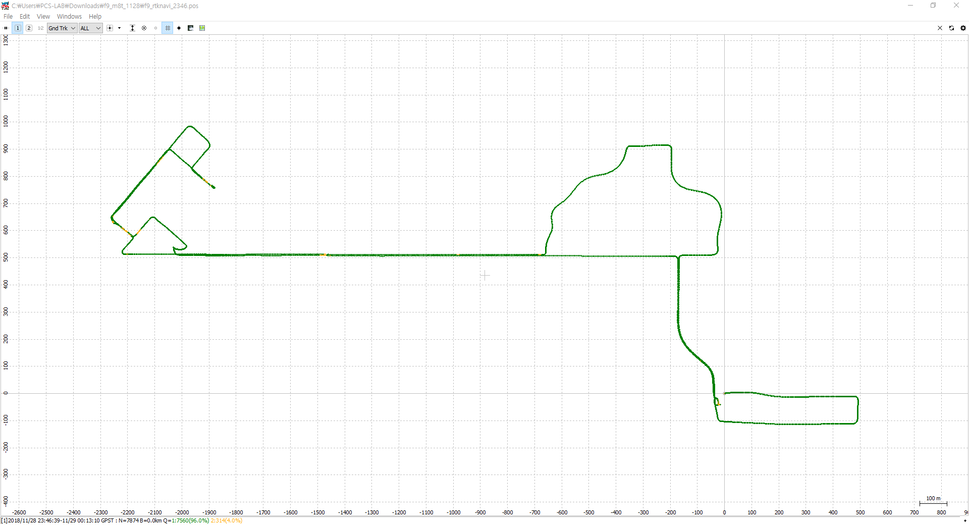 아래 그림은 RTKNAVI의 RTKPLOT를 이용하여 rtkexplorer에서 제공하는 샘플 위치 값(위도, 경도)을 확인한 결과입니다. 초록색은 fix, 노란색은 float 상태입니다.